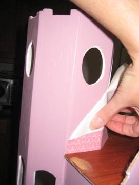 I started with the smallest outside side of the tower first, and just cut the paper to the line, or actually slightly above it. I also cut a slight overhang on the edge so that I can wrap it around to the inside of the tower. I'm using a prepasted vinyl paper, so I go ahead and put wallpaper paste on both the tower itself and the wallpaper, and then I laid that small piece in, wrapped it around, and rubbed it down with a dry cloth.