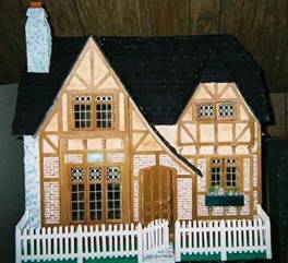 I began "bricklaying" at 0830; it took 5 1/2 hours to glue the individual "brick" faces to the card templates and the finished product POPS! So I painted a dirty wash of 5 parts white to one part each black & burnt umber and LOTS of water, applied it wet and patted with a tissue and it looked much better. When dry I cut out the infill areas of the bricked card and glued them to the house.