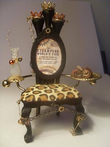 Linda changed gears just a bit for this chair. (Sorry, I couldn’t resist the pun.) This is steampunk design at its most innovative and ornamental.